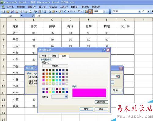 6、單擊“格式”按鈕后會彈出如圖對話框,這時我們單擊“圖案”按鈕,然后選擇填充顏色紅色,如圖2.