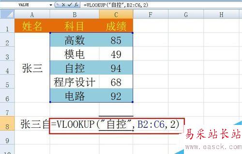 例如,如果我們想要找出“張三的自控成績(jī)”,該如何做呢?此時(shí),我們只需要在單元格“C8”中輸入公式“=VLOOKUP("自控",B2:C6,2)”并按回車鍵。即得結(jié)果。