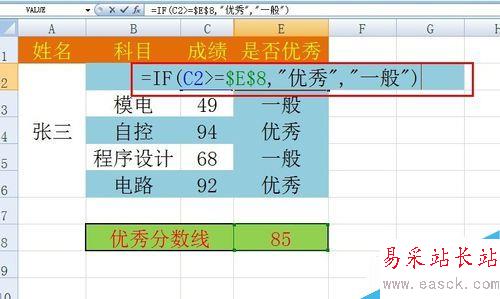 如圖,要判斷各課成績(jī)是否達(dá)到優(yōu)秀,則只需要在只需要在E2單元格中輸入內(nèi)容“=IF(C2>=$E$8,"優(yōu)秀","一般")”并按回車鍵即可自動(dòng)生成,最后將公式復(fù)制到下面各單元格。
