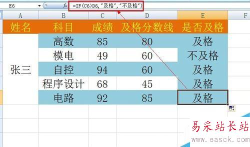 數(shù)據(jù)比對(duì)中,最簡(jiǎn)單的一種需求就是不同列之間同行數(shù)據(jù)的比對(duì)。例如如圖所示的圖表,要計(jì)算“是否及格”列,只需要在E2單元格中輸入內(nèi)容“=IF(C2>D2,"及格","不及格")”并按回車鍵即可自動(dòng)生成,最后將公式復(fù)制到下面各單元格。