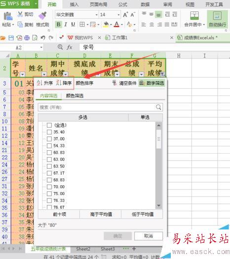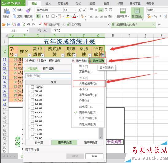 2、如圖所示,這時候標題行的所有右下角都有倒三角的標志,點擊它就會出現如圖所示的菜單欄,這時候點擊圖中箭頭所示的”數字篩選“按鈕,又會彈出菜單欄,在根據需要篩選,我這里是要平均成績大于等于80,所以就選擇大于等于