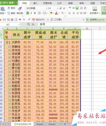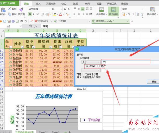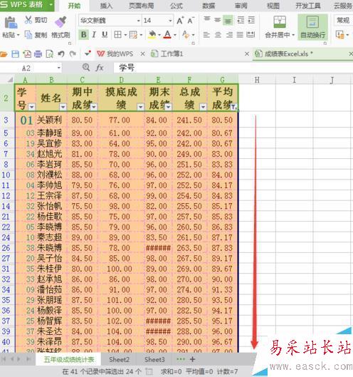 4、這個時候,篩選就完成了,如圖,都是按照平均成績篩選出的大于等于80的學生