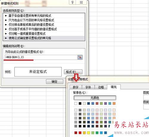 6、在“編輯規(guī)則說明”里輸入“=MOD(ROW(),2)”,選擇要填充的顏色