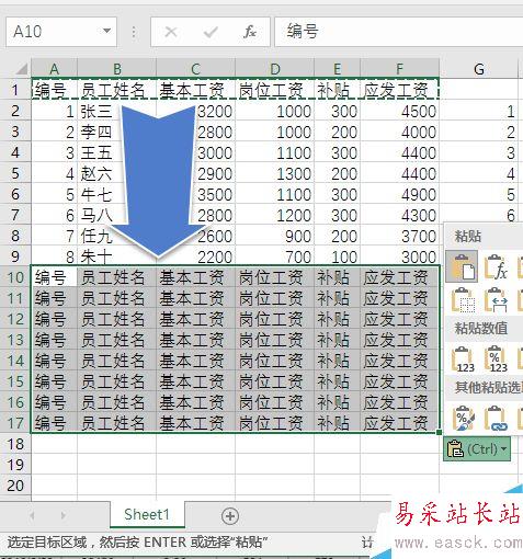 復制標題行,然后批量選中下方空白區域,執行粘貼命令,填充至下方的空白區域,粘貼的區域要與第二組輔助列的行數保持一致。