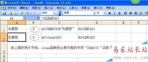 =CLEAN(text),要從text中刪除非打印字符的任何工作表信息。CLEAN 函數被設計為刪除文本中 7 位 ASCII 碼的前 32 個非打印字符(值為 0 到 31)。實例解說見圖。
