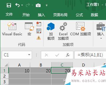 現(xiàn)在回到Excel表格中,來試試自定義的函數(shù)。在A1單元格輸入10,A2單元格中輸入20,A3單元格中輸入公式“=乘積(A1,B1)”,果然得出了正確的乘積數(shù)。