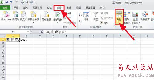 6、這樣子,單元格A1中的字符串“驗,舊,森,y,u,1”已經按照半角逗號“,”分列好了。