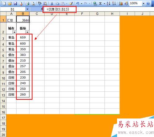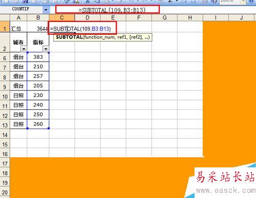 4、隱藏后,SUM函數求和所得到的還是所有指標的總和,而不是未被隱藏的城市的指標和。這時候,我們用SUBTOTA函數來試一下,在另外的單元格中輸入:=SUBTOTA(109,B3:B13)。稍后我會為大家解釋這個公式的含義。