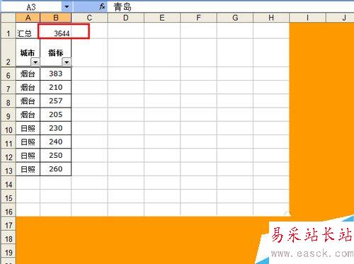 1、首先,我們來看一下本次實例用到的數據,這里有三個城市,要求就是當我將青島的所有數據隱藏后,匯總的時候統計的是未被隱藏的城市的指標總和,而當我將青島的數據取消隱藏后,匯總自動統計的是全部指標的總和。