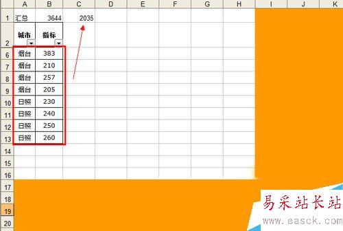6、接下來,我們將青島的指標隱藏,發現,SUBTOTAL函數顯示了未被隱藏的城市的指標總和,這也就達到了我們要的效果。