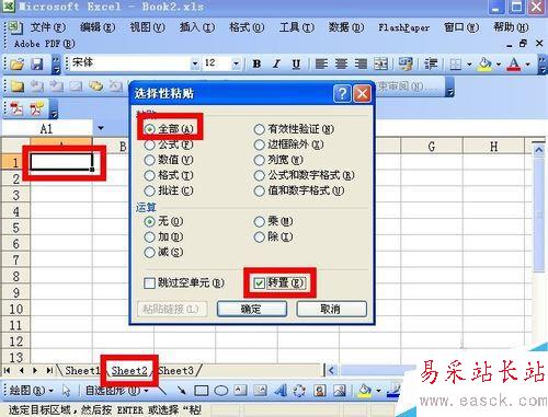 4、接著新建一個空白工作表sheet2,把光標(biāo)定位在A1單元格,然后右擊,在彈出的右鍵菜單里選“選擇性粘貼”,接著勾選如下圖4所示的兩項,然后單擊確定按鈕,即可把sheet1的內(nèi)容粘貼過來了。