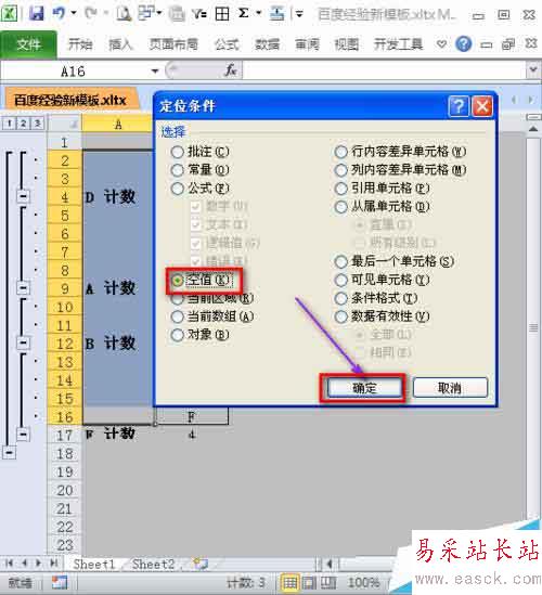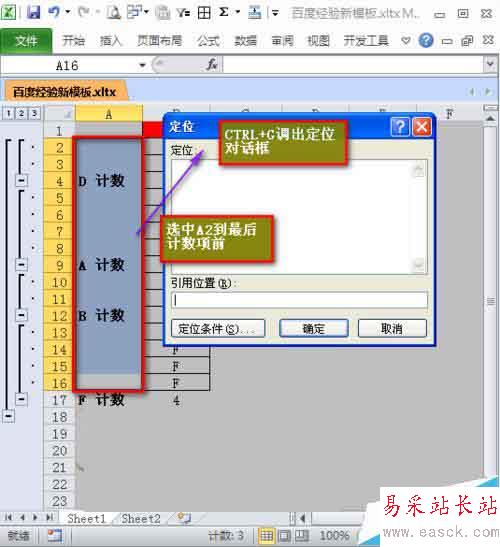 3、分列匯總后,會在原數(shù)據(jù)的左側(cè)增加一列,顯示匯總結(jié)果,我們選擇A2到最先面的計(jì)數(shù),第一行是標(biāo)題字段,所有我們從A2開始選擇,按下F5單元格或者CTRL+G調(diào)出定位對話框,這個(gè)我們前面都有介紹,然后點(diǎn)擊定位條件。