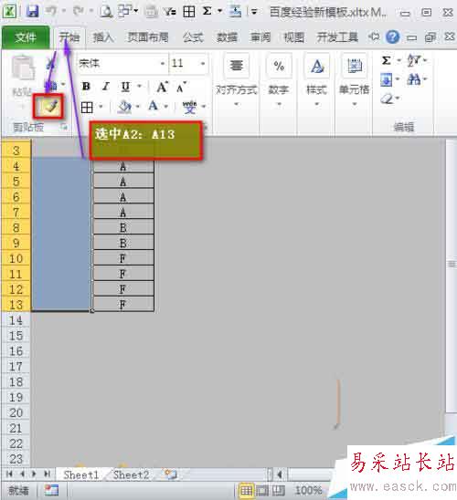 8、選中A2:A13,然后點(diǎn)擊開始選項(xiàng)卡中的格式刷。把格式先復(fù)制出來。