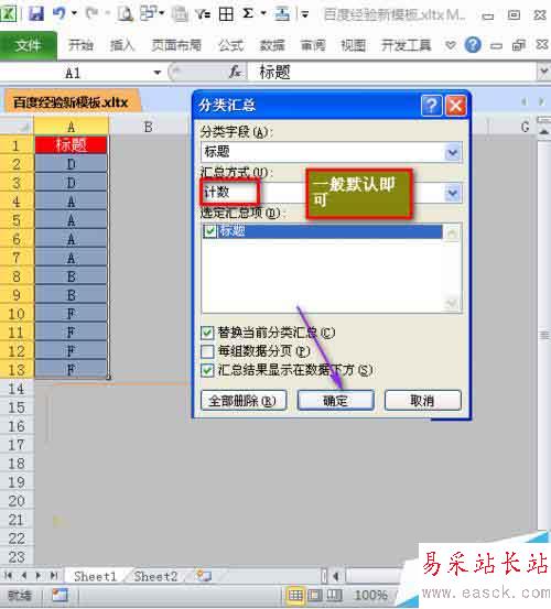 2、點(diǎn)擊分類匯總后,內(nèi)部我們一般選擇一個(gè)字段計(jì)數(shù)就可以了,其他就默認(rèn)設(shè)置即可,然后點(diǎn)擊確定按鈕