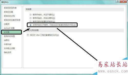 4、啟用所有宏。彈出“信任中心”對話框,單擊“宏設置”選項,在右側的面板中單擊“啟動所有宏(不推薦,可能會運行有潛在危險的代碼)”單選按鈕,最后單擊“確定”按鈕,如下圖所示。