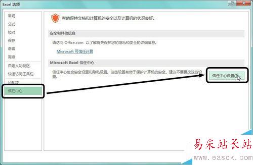 3、單擊“信任中心設置”按鈕。彈出“Excel 選項”對話框,單擊“信任中心”選項,再單擊“信任中心設置”按鈕,如下圖所示。