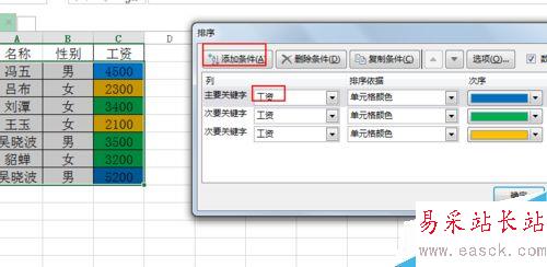 4、主要關鍵字為工資,依據為單元格顏色,多添加幾個條件。