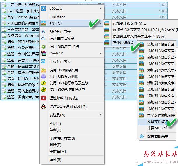 如果你在使用好壓這款壓縮軟件,批量更名也可以照下面的方法快速完成。在文件夾中選中所有要更名的文件,右鍵單擊并選擇“好壓→其他壓縮命令→批量文件改名”菜單命令。