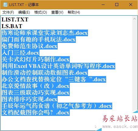 保存這個BAT文件之后,雙擊此文件,你會發現文檔目錄中生出一個新文件LIST.TXT。打開它看看,原來是文件列表清單。去掉上面的兩行,只留下有用的清單。