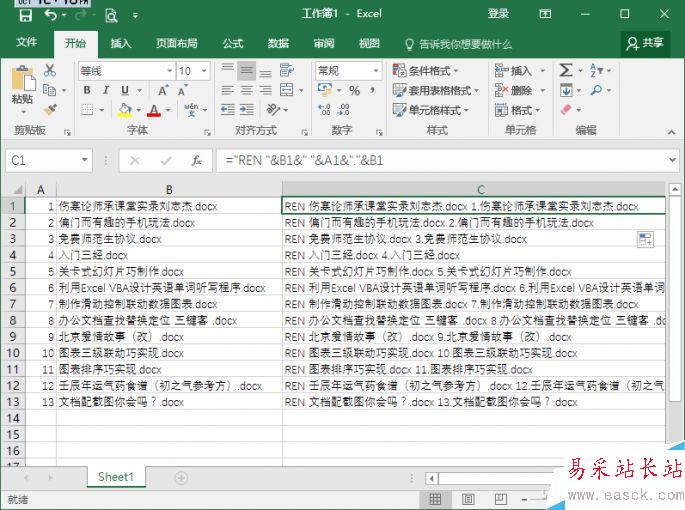 有了清單就好辦,現在我們將其復制到一張空白的Excel表格的B列當中,然后在A列填上自動數字序號,在C1單元格中輸入一個簡單公式“="REN "&B1&" "&A1&"."&B1”,回車后下拉填充C1到C列末尾。然后復制C列單元格內容。