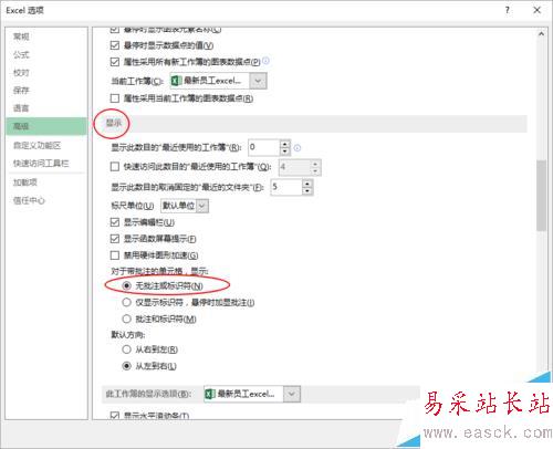 6、在其中找到顯示欄,勾選其中的無批注和無標識符。如圖所示:
