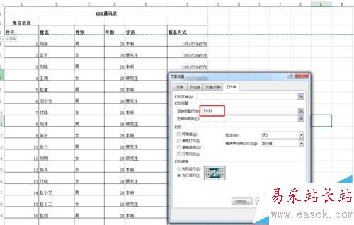 6、選擇完后在選擇完成的框中按回車,則會跳回到頁面設置頁。如下圖中就設置好了重復標題行。另一種設置方式其實就實際直接在【頂端標題行】中書寫公式。公式格式為 $起始行:$結束行 設置完成后點擊【確定】完成設置。