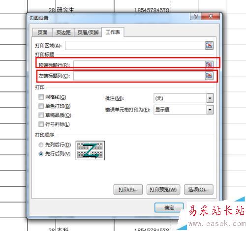 4、如下圖中,打開的打印標題設置頁面中,工作表中有兩項。其中【頂端標題行】指的是設置打印頂端的標題,頂端標題指的是打印出來之后在紙張頭部的數據。當然可以指定excel的前幾行,或者指定中間的幾行。當指定中間幾行數據時,第一頁按照excel中的數據展示,從第二頁開始,紙張頭部將打印選定的幾行。【左側標題行】指的是重復左側的列,此處需列數超過紙張范圍時列方向的多頁才會重復打印。