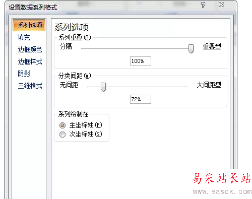 4、選擇圖表“系列1”,設(shè)置系列選項(xiàng)如圖4所示,填充為“純色填充——藍(lán)色”,邊框顏色為“無(wú)線條”。