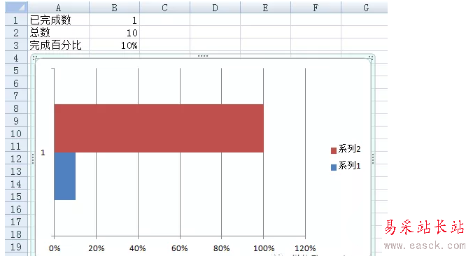 9、此時(shí),我們改變已完成數(shù)的值,圖表會(huì)自動(dòng)更新,展示進(jìn)度情況,如圖9所示。在圖表的右側(cè),添加了一個(gè)文本框,與單元格B3鏈接,以顯示進(jìn)度值。