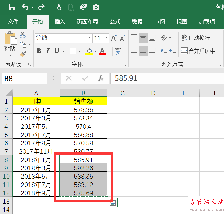 2、選中2018年銷售額數據,并按下Ctrl+x,完成數據剪切。