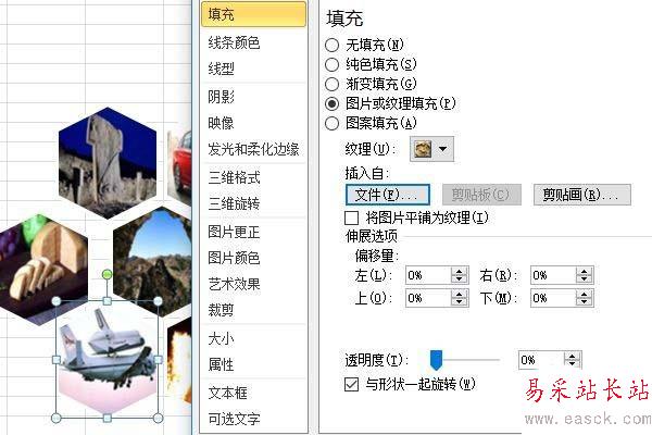 5、在每一個(gè)圖片框上單擊【格式】中的【形狀樣式】,在填充中選擇圖片或紋理填充