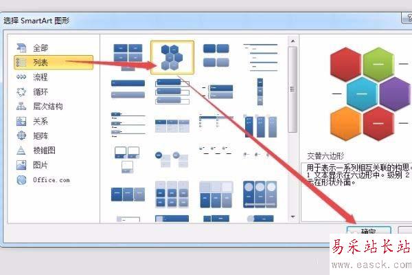 1、新建一個(gè)excel工作表,在菜單欄中的插入中,找【smartart】命令單擊【列表】,選擇【交替六邊形】后單擊【確定】