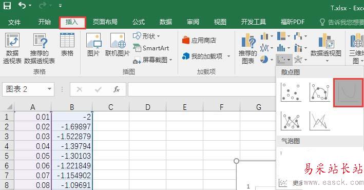 7、選中A、B兩列,依次點擊“插入”、“散點圖”、“帶平滑線的散點圖”