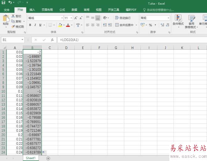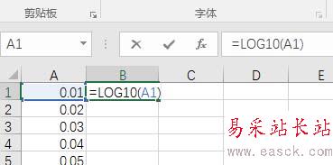 5、在B1單元格輸入“=LOG10(A1)”,即求出以10為底的對數函數值