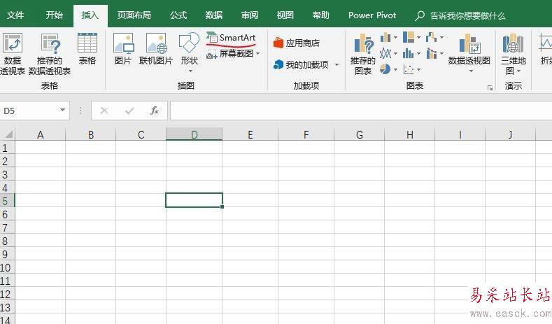 1、在excel中,點擊“插入”菜單中的“SmartArt”按鈕。