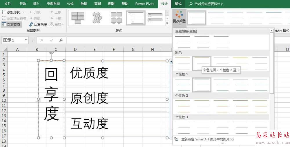5、可以通過菜單中的“更改顏色”按鈕,來修改圖形的顏色