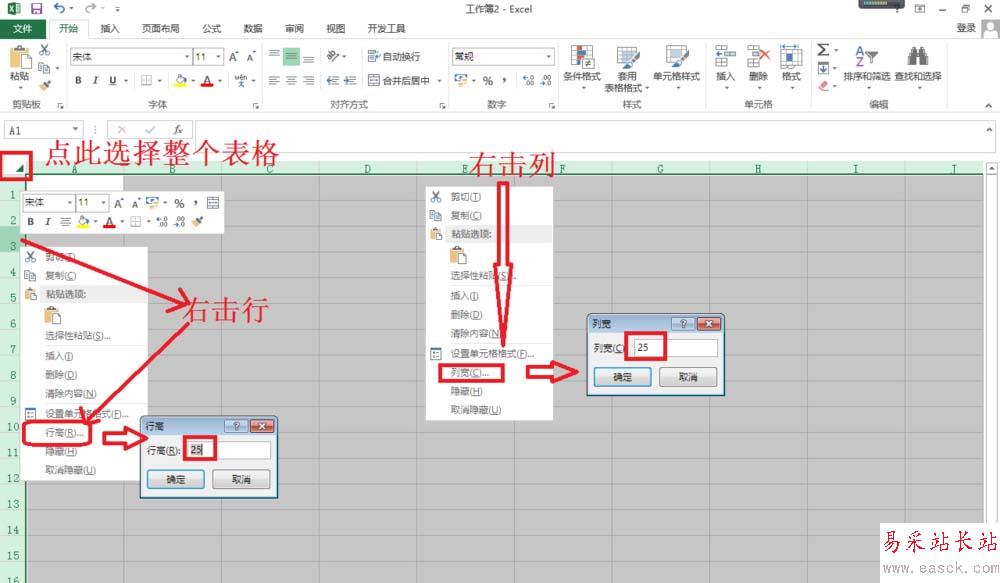 1、打開EXCEL2013,新建一個空白表格,選擇整個表格——右擊行,選擇行高,設置行高為25,右擊列,選擇列寬并設置為25.