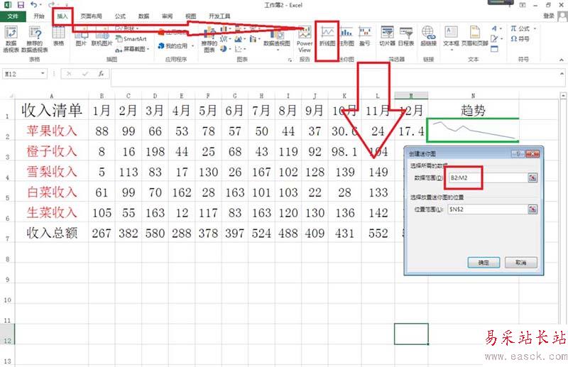 4、在收入清單最后一列輸入:趨勢——點擊選擇下一單元格(如圖N2)——點擊插入——選擇拆線圖——數據范圍選擇B2:M2,位置范圍保持默認$N$2——點擊確定。這樣就可以直觀查看收入趨勢如何了。