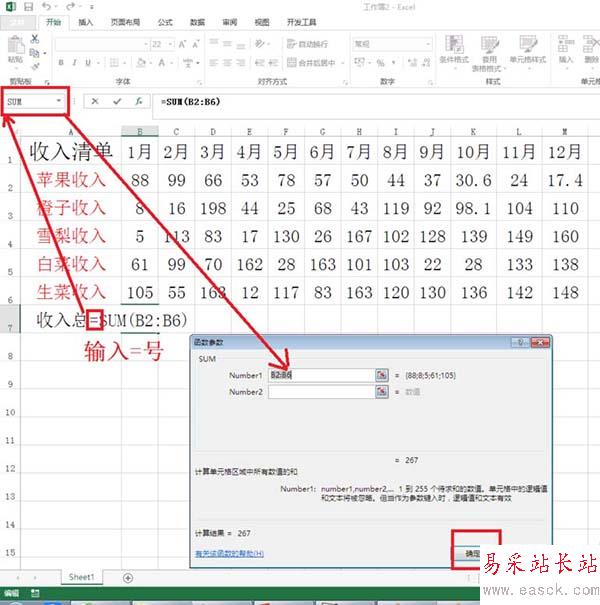3、在收入詳細清單最后一行增加一行:收入總額——利用SUM統計每個月總收入,如圖在B7單元格輸入=號,選擇SUM函數,選擇B2:B6單元格,點擊確定——然后向右填充公式統計其它月份的收入總額。