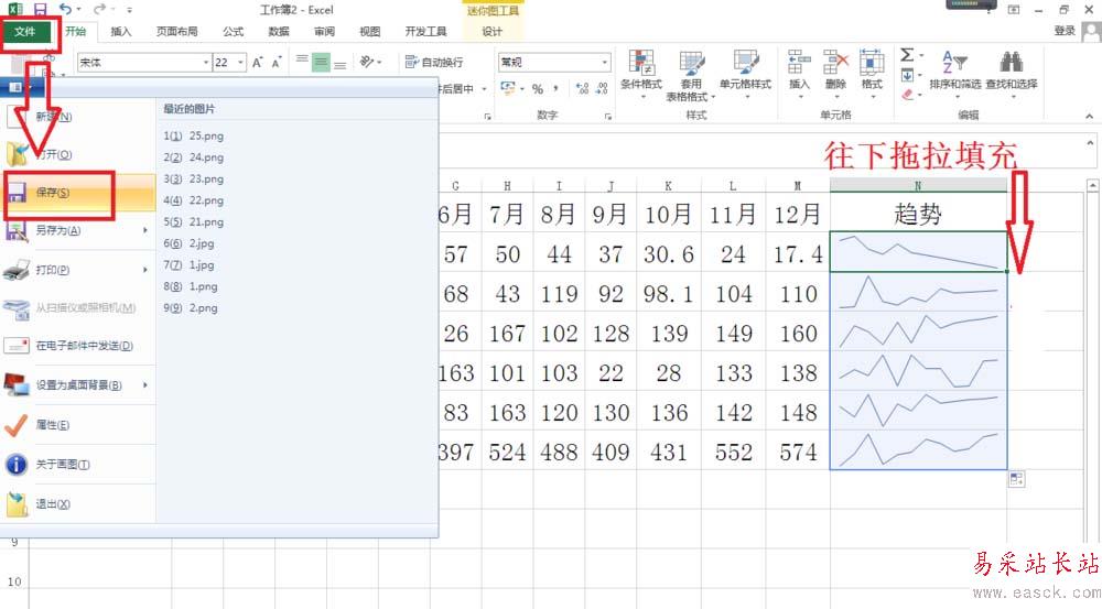5、最后,選擇N2單元格,把鼠標放在右下角,當出現黑色+字時往下拖拉填充,就可以查看每種收入的趨勢了。然后點擊文件——保存,把它保存到指定文件夾就可以了。
