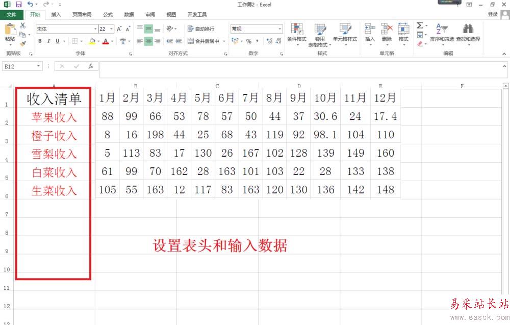 2、設置表頭和輸入數據:在第一列設置收入清單,在第二列開始,設置每個月份的收入情況(也可以設置成每日的收入情況)——設置好字體的大小并居中。