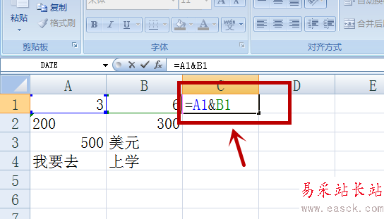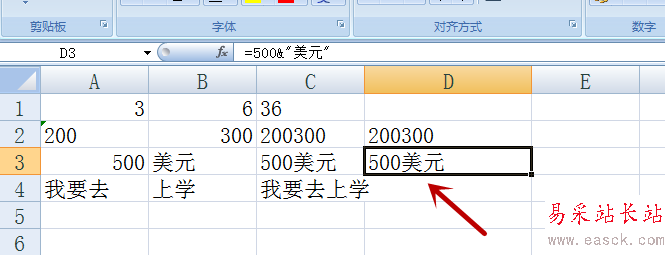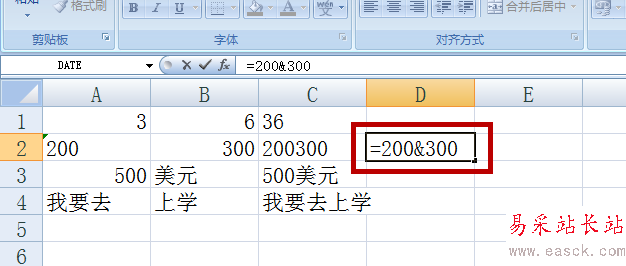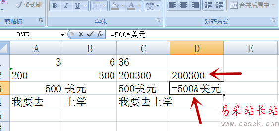 5、我們直接在單元格輸入=200&300,可以將數字直接進行連接,不管什么格式,如圖所示。我們在輸入=200&美元,如圖所示。