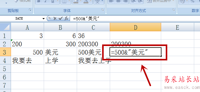 7、我們需要將文本數據用英文的引號括起來,才能讓&連接符正常運算,輸入的結果如圖是500美元。