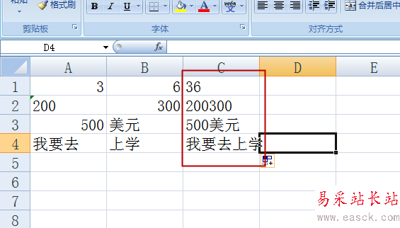 4、我們將運算模式應用到其它數據中,可以看到數字和文字都可以進行連接,如圖所示。