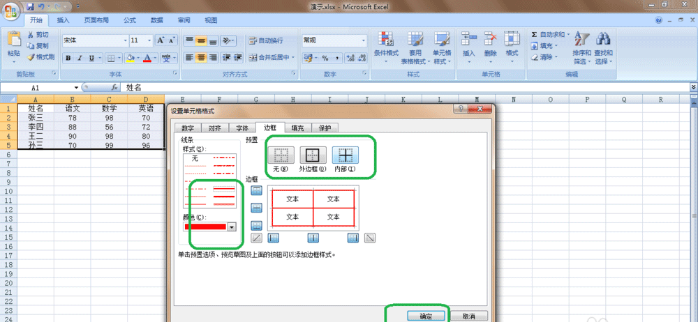 5、選擇邊框的顏色和線條及設(shè)置邊框的類型,然后點(diǎn)擊確定。