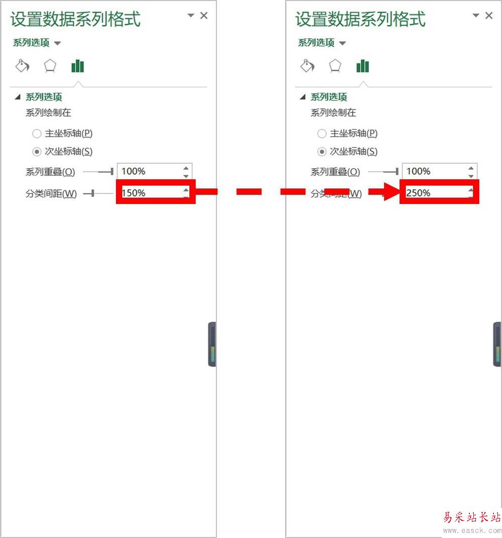 6、再次選中柱形圖并鼠標右鍵單擊,選擇"設置數據系列格式"(下圖1)。