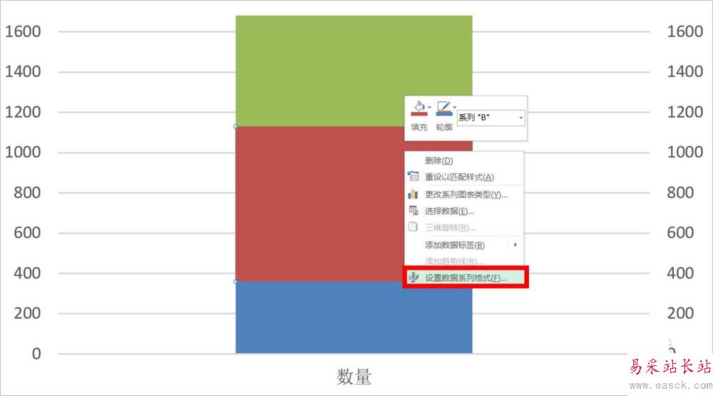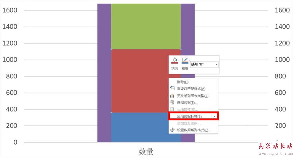 7、然后,為堆積的柱形添加數據標簽(選中柱形>鼠標右鍵單擊>點擊"添加數據標簽",下圖1),下圖2是效果圖。
