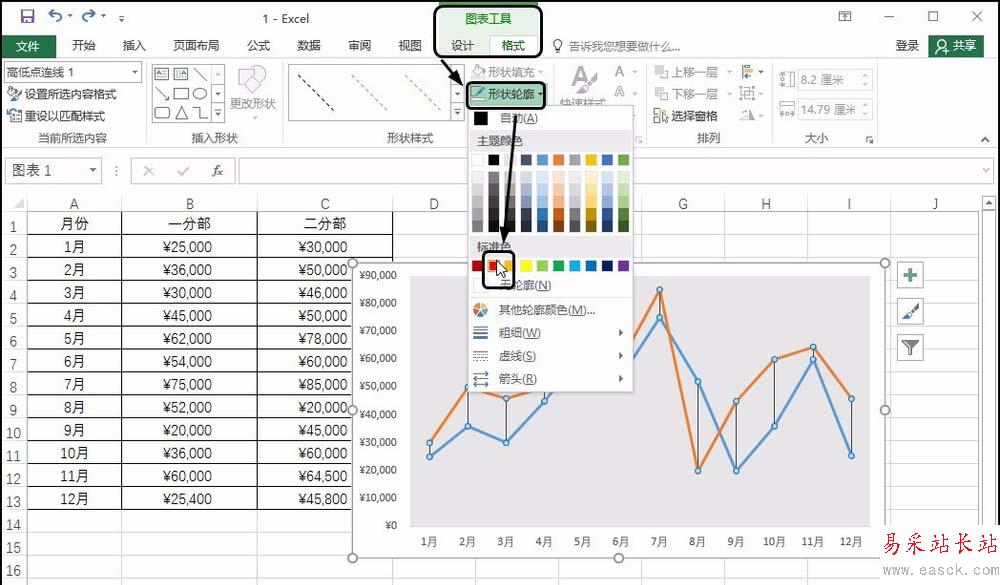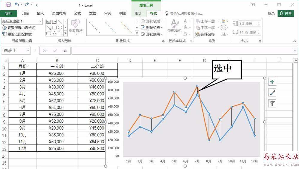 即可看到兩條折線圖之間使用了線條進行了連接,在圖表中單擊高低點連線,選中該線條,如下圖所示。