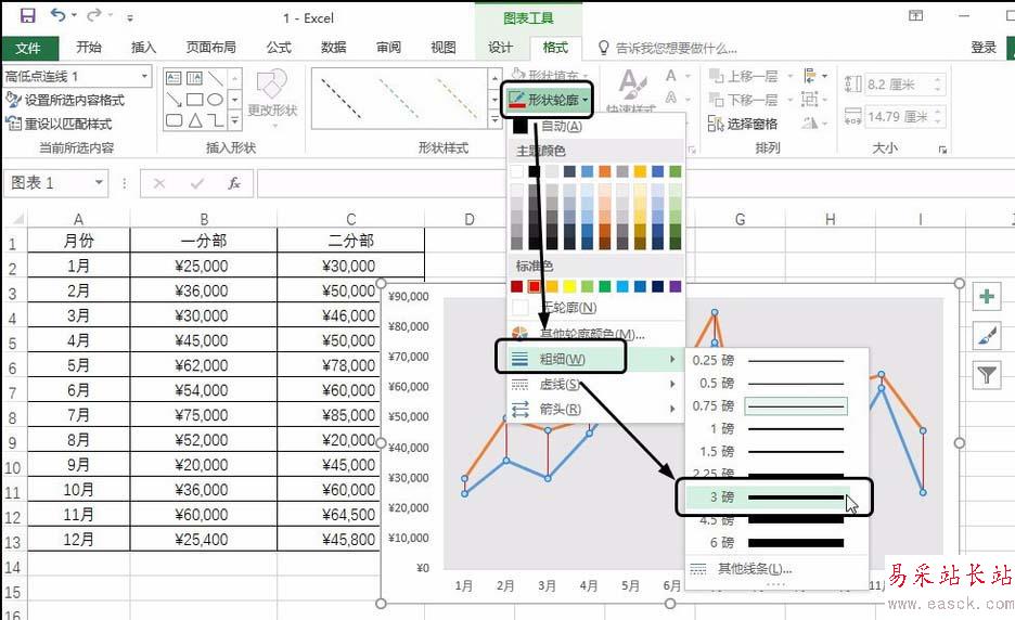 單擊“圖表工具-格式”選項卡,單擊“形狀輪廓”按鈕,在展開的列表中單擊“粗細”,在級聯列表中單擊磅數,如“3磅”,如下圖所示。