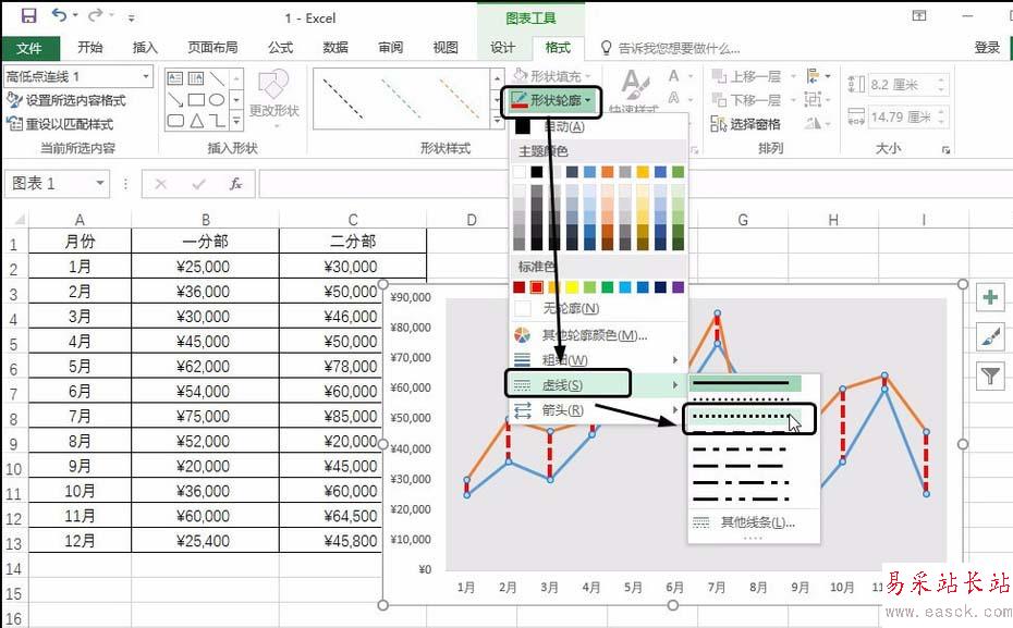 單擊“圖表工具-格式”選項卡,單擊“形狀輪廓”按鈕,在展開的列表中單擊“虛線”,在級聯列表中單擊要應用的虛線樣式,如下圖所示。